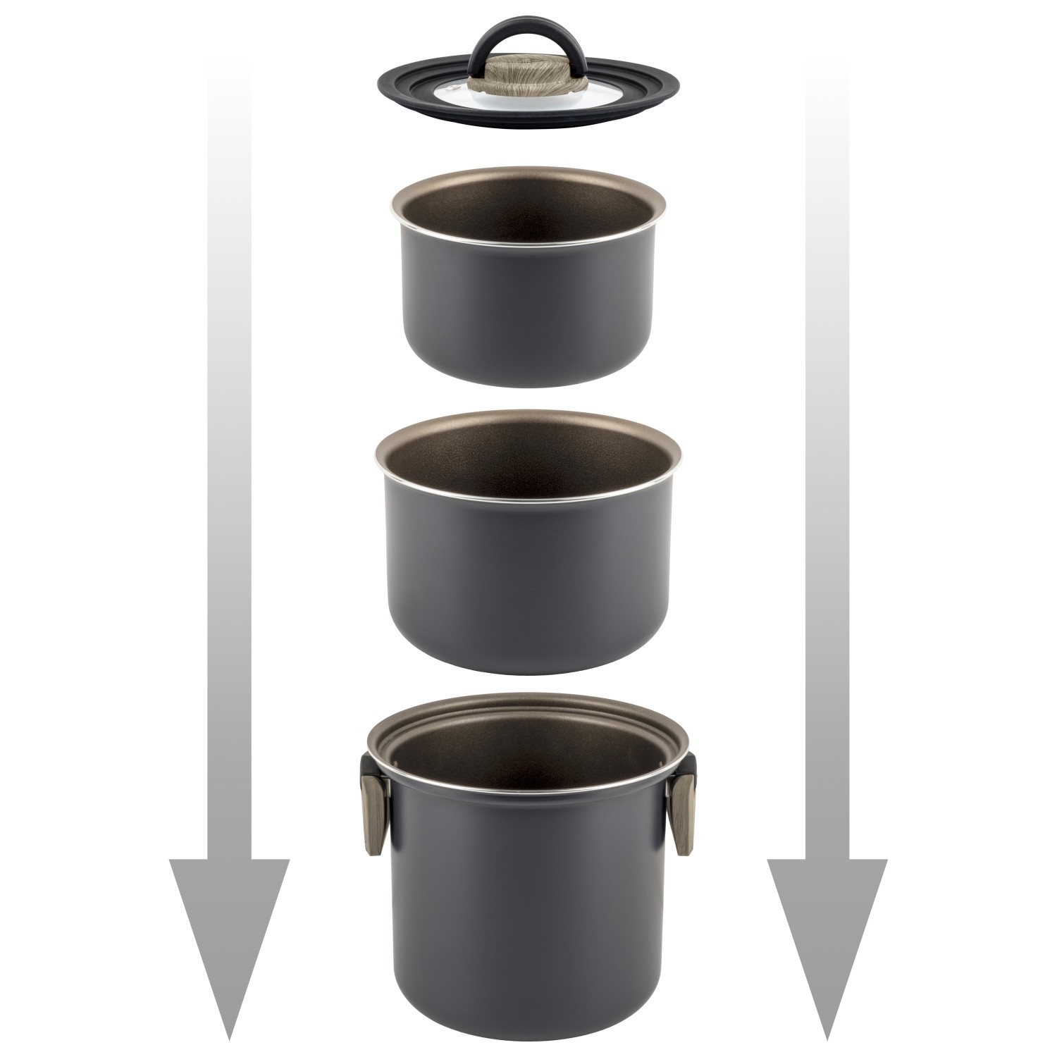 - 5 pentole (imponibili); manici rimovibili; 2 coperchi, padelle/protezione pentola; maniglia di trasporto