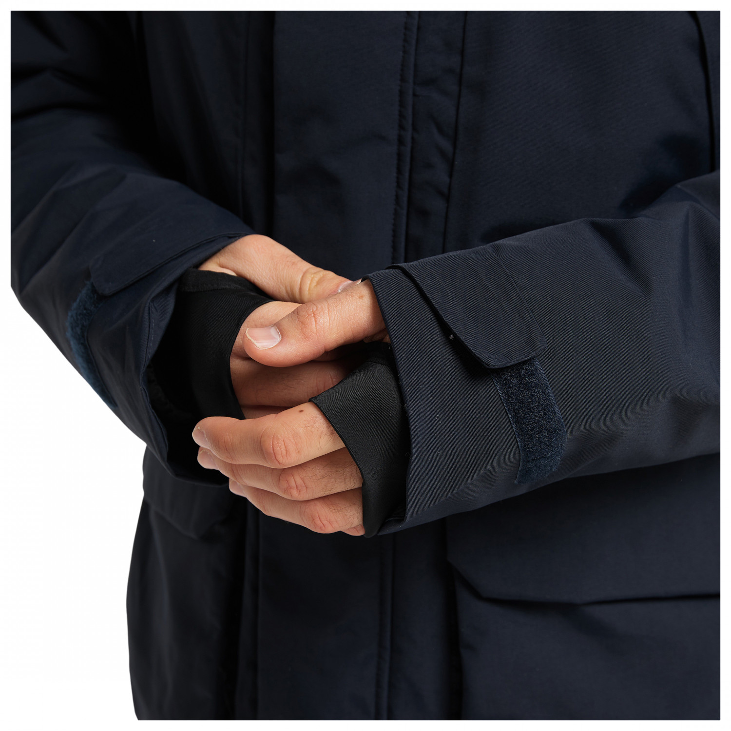 - Chiusure a strappo sulle maniche, Finiture interne elastiche, passante per pollice, dettagli riflettenti, schiena allungata