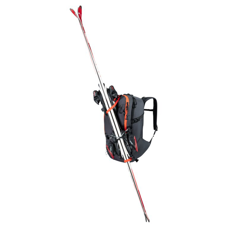 - porta piccozze e bastoncini, portacasco, scomparto per materiale antivalanga, tasca frontale con cerniera, porta sci/snowboard