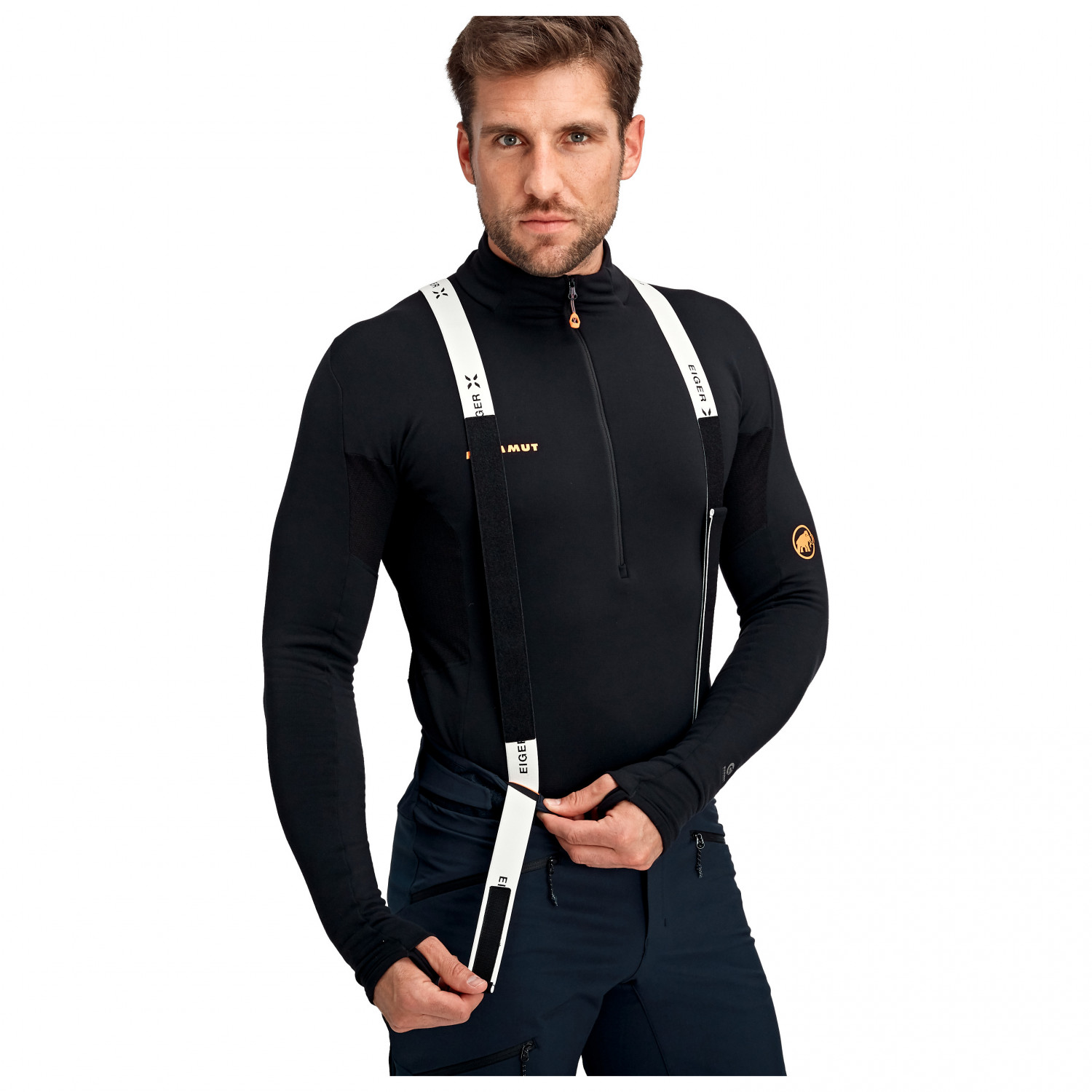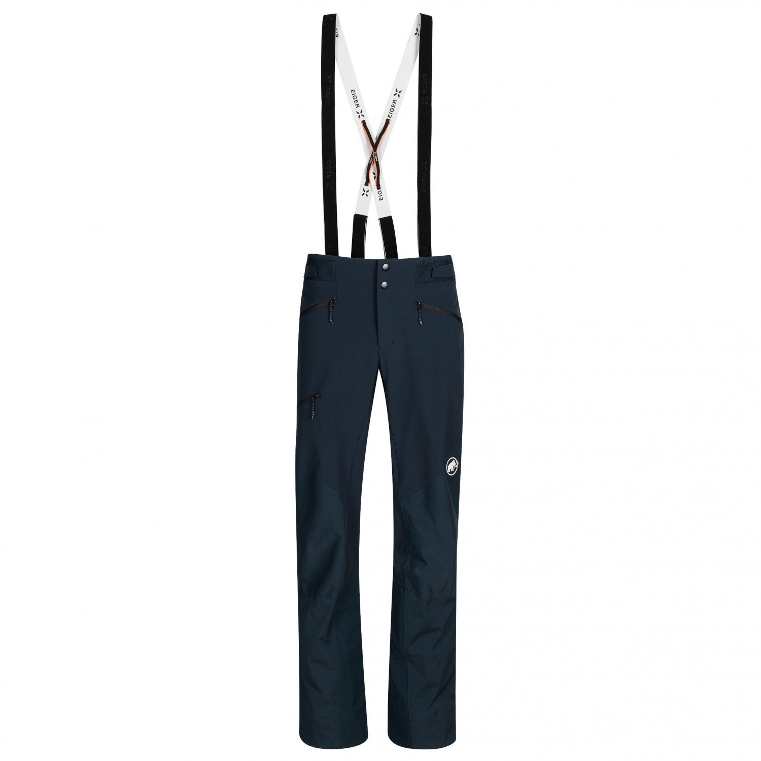 - Bretelle rimovibili, Protezione bordi, Cerniera sui fondi gamba, Finiture gambe regolabili