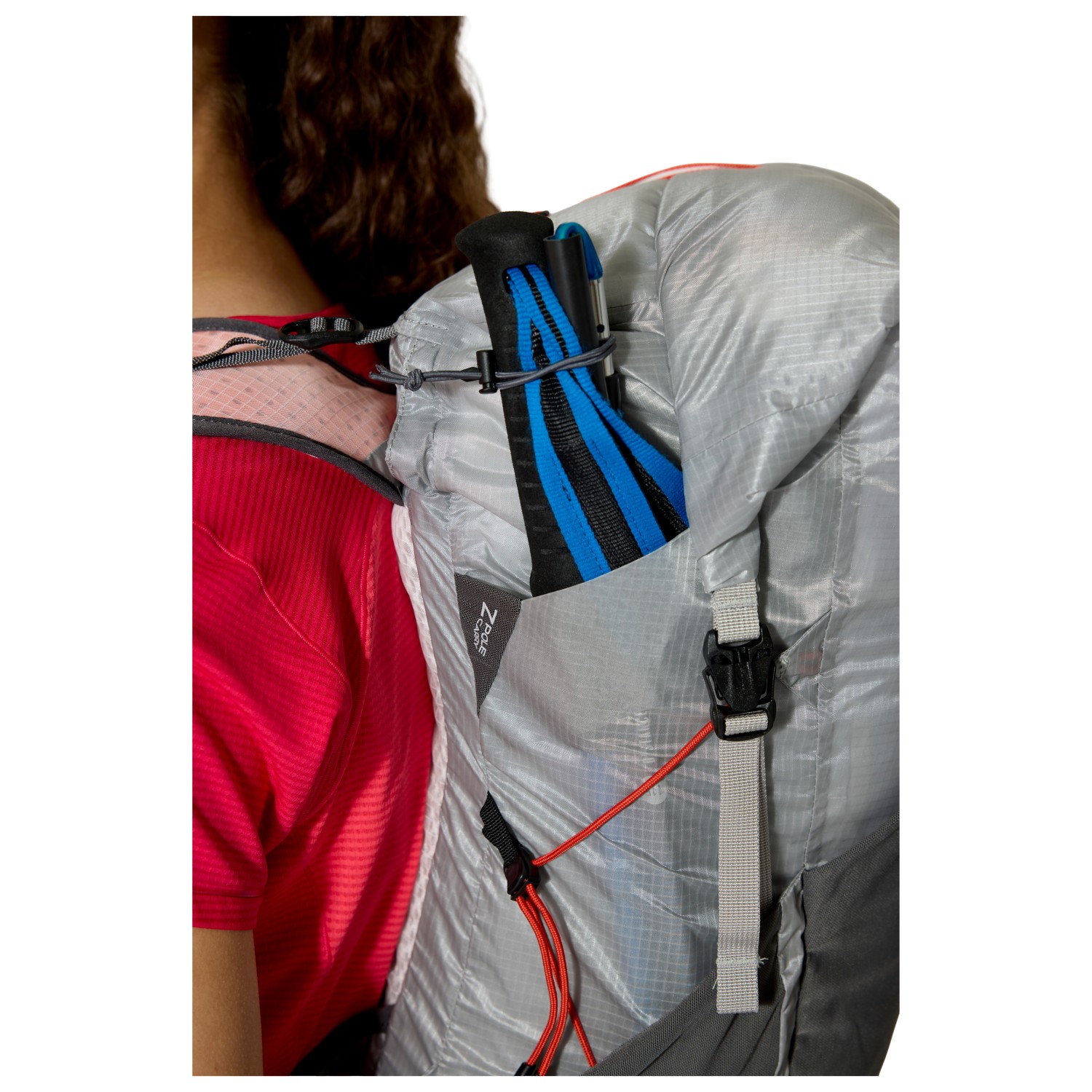 - 2 tasche laterali mesh, fissaggion per bastoncini da trekking, vano frontale