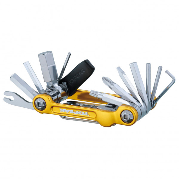 - Inbus, Torx, chiave per raggi, catena, gancio di fissaggio catena, rompi punzoni, leva copertone, apribottiglie con portaraggi, tasca in neoprene, leva allungata, pretensionamento attrezzo regolabile